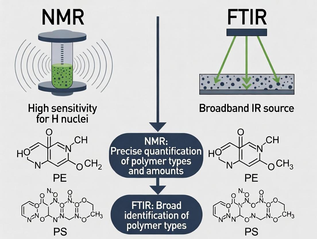 This article provides a detailed technical analysis of Nuclear Magnetic Resonance (NMR) and Fourier-Transform Infrared (FTIR) spectroscopy for the precise quantification of microplastics in biomedical and pharmaceutical contexts.